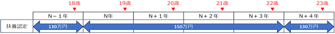 - N年~N+3年の間(19歳の誕生日を迎える年から22歳の誕生日を迎える年)における年間収入要件は、月125,000円(年150万円)未満。